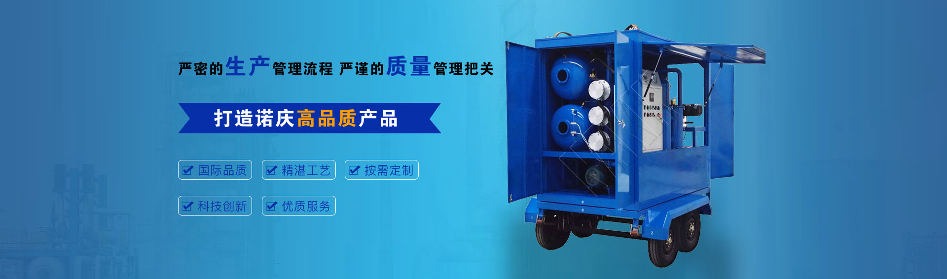 公司通過(guò)ISO9001-2015質(zhì)量管理體系認(rèn)證,CE歐盟認(rèn)證,諾慶公司所有濾油機(jī)配套產(chǎn)品均采用國(guó)內(nèi)外知名品牌,經(jīng)過(guò)多年的使用,具有質(zhì)量可靠,性能優(yōu)良。公司擁有完備的檢測(cè)儀器和檢測(cè)設(shè)備,所有產(chǎn)品出廠前經(jīng)過(guò)嚴(yán)格測(cè)試,保證每一臺(tái)產(chǎn)品合格出廠。生產(chǎn)實(shí)力雄厚